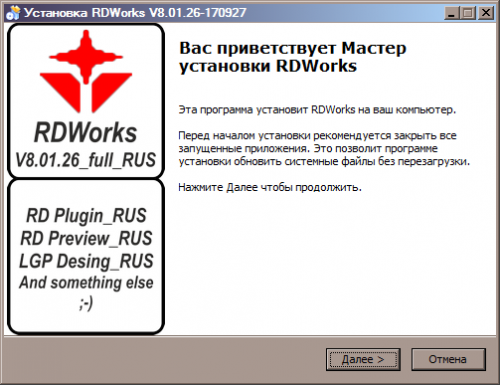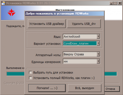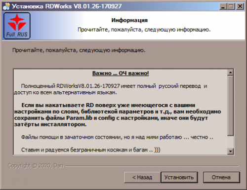 Полностью переведённый на русский язык установщик RDWorksV8.01.26/RDCamV8.01.26. При переводе диалоговые окна полной программы не менялись. В урезанной версии плагина были изменены диалоговые окна с целью подгонки размеров под русский перевод. Основное ядро программы не менялось. Доступны все четыре языка. Для теста и примера добавлена небольшая библиотека параметров - можно посмотреть.