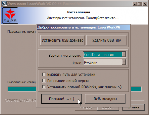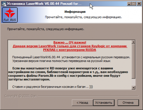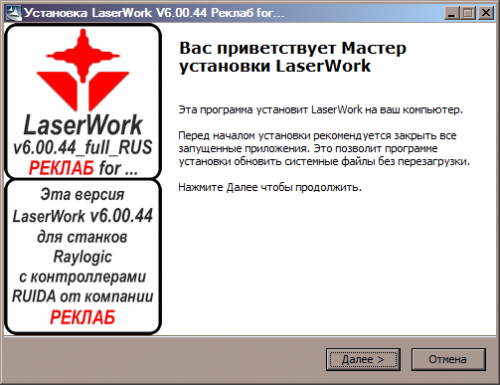 Старый, добрый и всем известный LaserWorkV6.00.44 для контроллеров к станкам Raylogic от компании Реклаб с полным переводом урезанного плагина, полной версии программы, LGP Design, пересборкой инсталлятора и т.д.