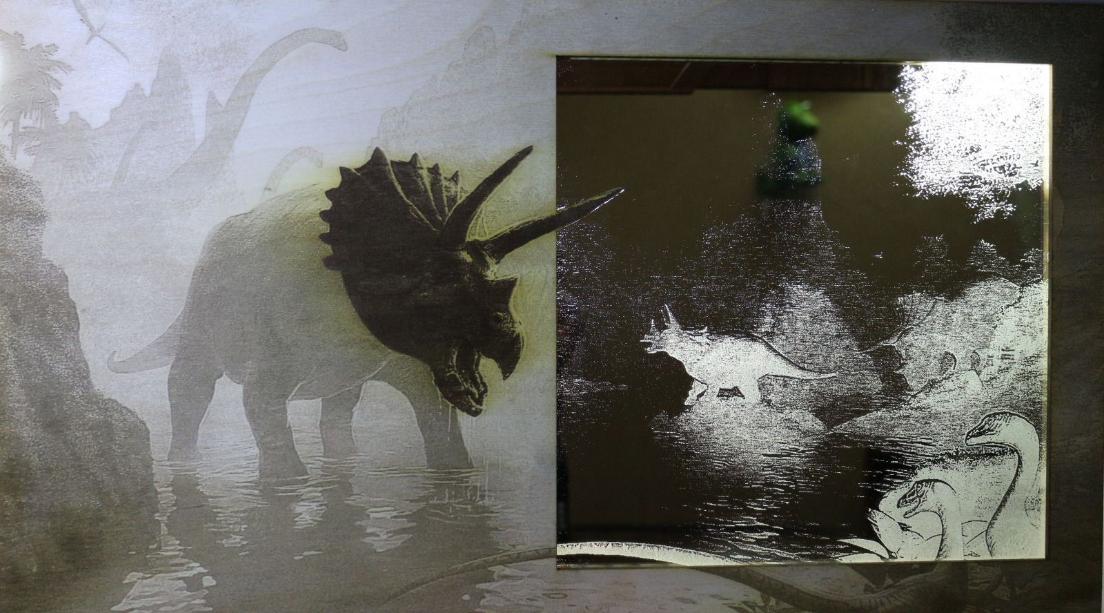 Моловина картины выгравирована на фанере, вторая на зеркале