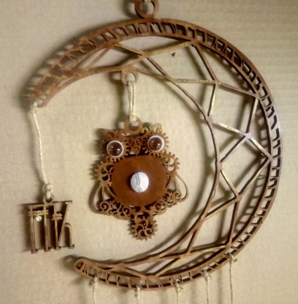 Подарочная штука. Снизу на ниточках деревянные пёрышки. Покрашена лазурью + лессировка пигментом. Глазки и на пузике - натуральные камни. Картинка луны взята из интернета, сова - личная отрисовка.